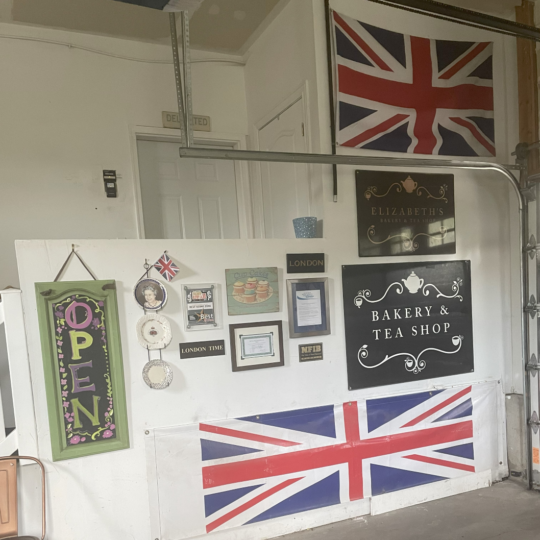 Let's Chat!I organized the garage for an owner of an english bakery and designed this for a wall for her out of extra signage and other items she had.